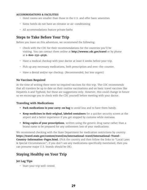 • Check with the CDC for their recommendations for the countries you’ll be
