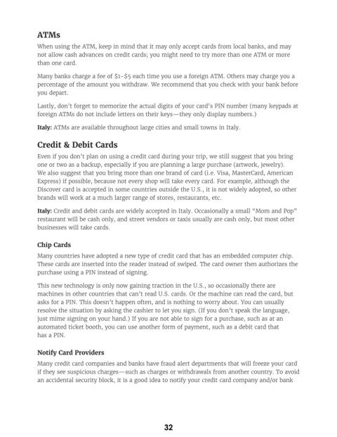 Italy: Credit and debit cards are widely accepted in Italy. Occasionally a small “Mom and Pop”
