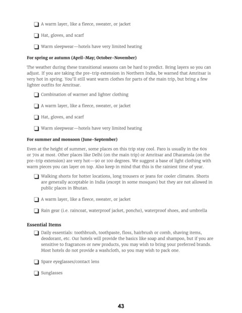 very hot in spring. You’ll still want warm clothes for parts of the main trip, but bring a few