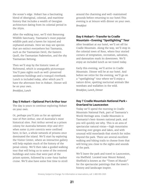 Day 5 Hobart • Optional Port Arthur tour Day 7 Cradle Mountain National Park •