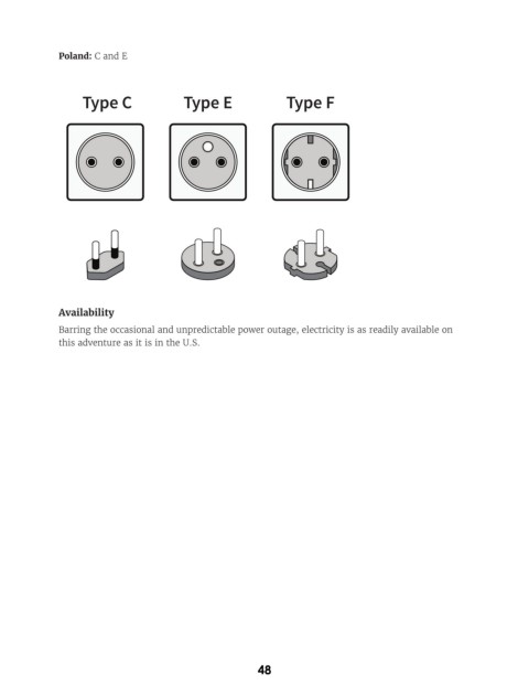 Poland: C and E Type C Type E Type F Availability Barring the occasional and unpredictable power outage, electricity is as readily available on this adventure as it is in the U.S. 48