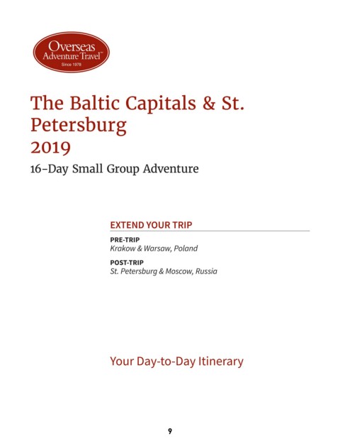 Overseas Adventure Travel SM Since 1978 The Baltic Capitals & St. Petersburg 2019 16-Day Small Group Adventure EXTEND YOUR TRIP PRE-TRIP Krakow & Warsaw, Poland POST-TRIP St. Petersburg & Moscow, Russia Your Day-to-Day Itinerary 9