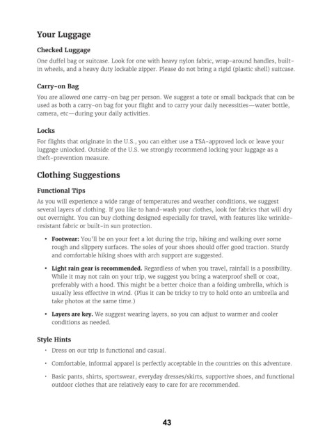 • Comfortable, informal apparel is perfectly acceptable in the countries on this adventure.