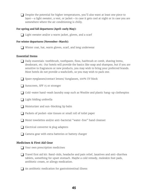 deodorant, etc. Our hotels will provide the basics like soap and shampoo, but if you are