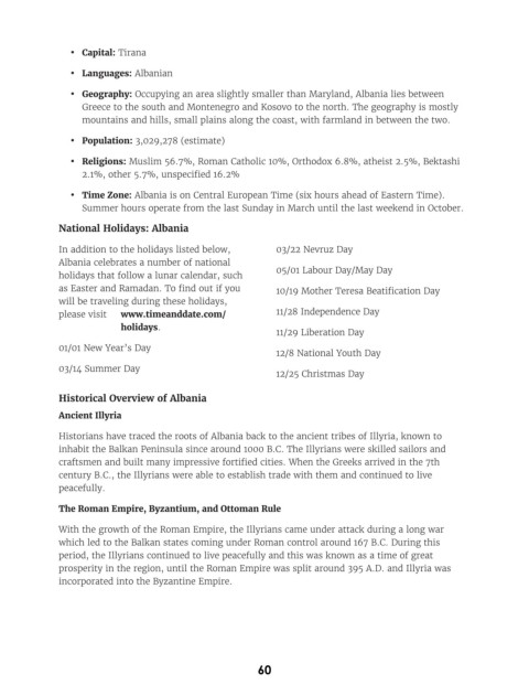 • Time Zone: Albania is on Central European Time (six hours ahead of Eastern Time).