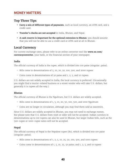 • Traveler’s checks are not accepted in India, Bhutan, and Nepal.