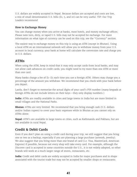 Bhutan: ATMs are very limited. We recommend that you bring enough cash (U.S. dollars