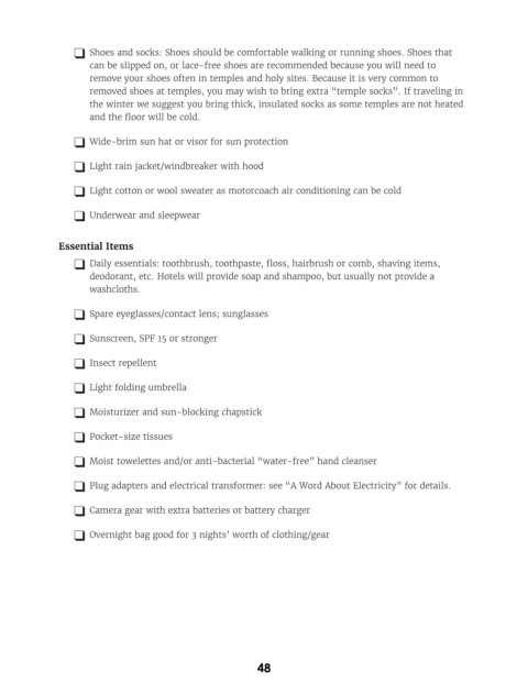 removed shoes at temples, you may wish to bring extra “temple socks”. If traveling in