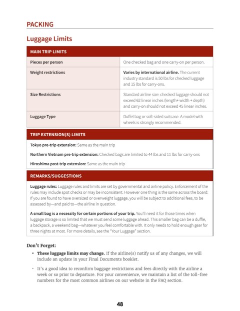 Northern Vietnam pre-trip extension: Checked bags are limited to 44 lbs and 11 lbs for carry-ons