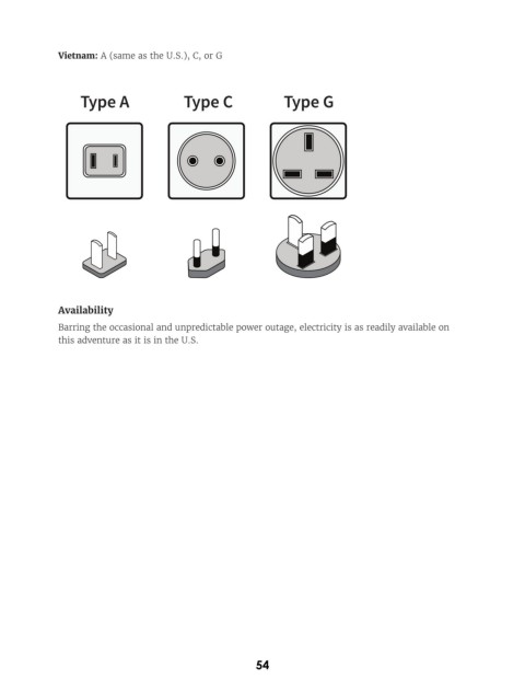 Vietnam: A (same as the U.S.), C, or G Type A Type C Type G Availability Barring the occasional and unpredictable power outage, electricity is as readily available on this adventure as it is in the U.S. 54