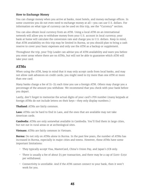 that ATM availability on this trip may be limited in Burma, so you should plan to bring a cash