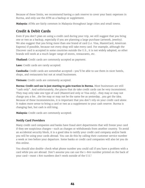 Cambodia: Credit cards are somewhat accepted—you’ll be able to use them in nicer hotels,