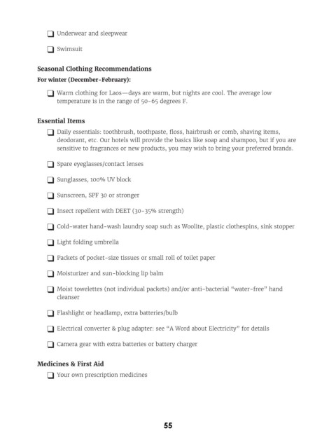 T Warm clothing for Laos—days are warm, but nights are cool. The average low