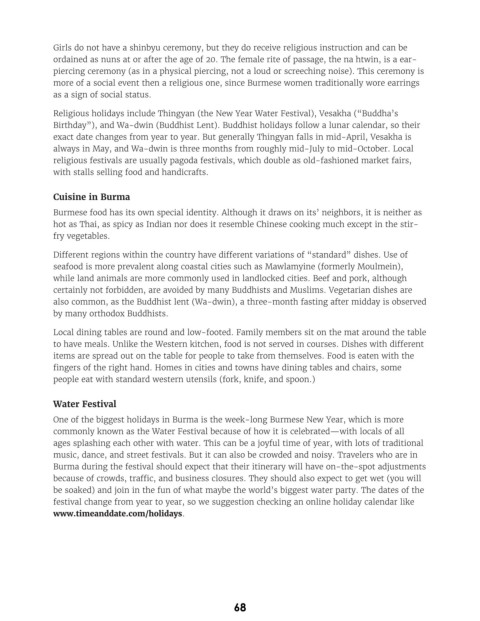 Religious holidays include Thingyan (the New Year Water Festival), Vesakha (“Buddha’s
