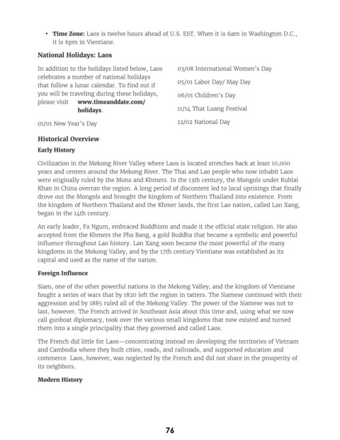 • Time Zone: Laos is twelve hours ahead of U.S. EST. When it is 6am in Washington D.C.,