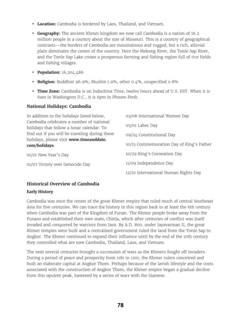 • Time Zone: Cambodia is on Indochina Time, twelve hours ahead of U.S. EST. When it is