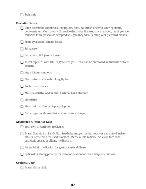 deodorant, etc. Our hotels will provide the basics like soap and shampoo, but if you are