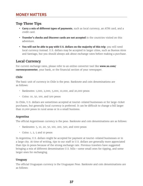 • You will not be able to pay with U.S. dollars on the majority of this trip; you will need