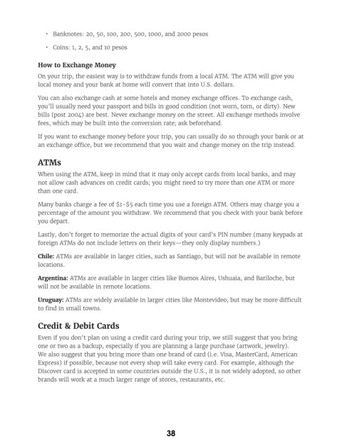 Chile: ATMs are available in larger cities, such as Santiago, but will not be available in remote