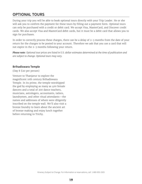 Please note: Optional tour prices are listed in U.S. dollar estimates determined at the time of publication and