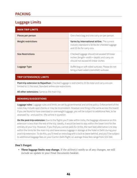 Post-trip extension to Rajasthan: Checked luggage is restricted to 33 lbs total and carry-ons are